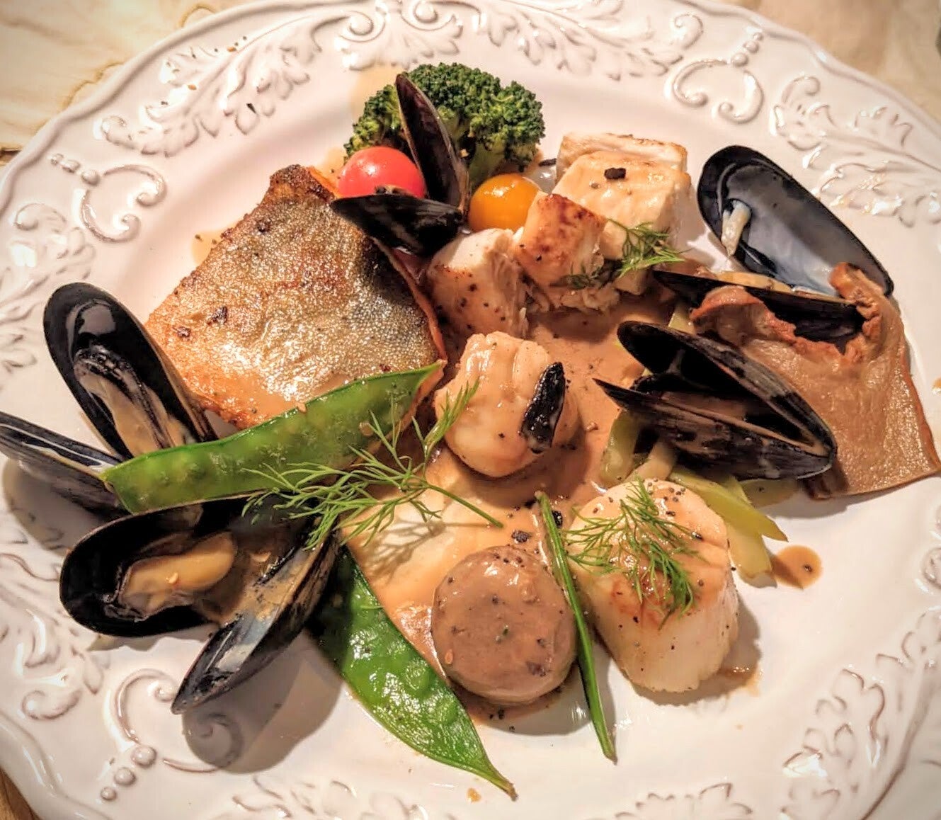 Scallops, Arctic char, and Halibut come together harmoniously in a delightful trilogy, offering three distinct textures and flavors to tantalize your palate. Scallops are perfectly seared to golden perfection, enhanced by a delicate drizzle of high-quality olive oil and a subtle touch of fleur de sel for just the right balance of seasoning. The Arctic char fillet is skillfully cooked on one side, allowing its skin to crisp up beautifully, while a small dab of salted butter adds richness and depth. Meanwhile, the halibut is carefully cut into generous, hearty cubes and gently poached in the flavorful cooking juices of fresh mussels, ensuring every bite is tender and infused with oceanic essence. A few vibrant, crunchy snow peas, a perfectly cooked small head of broccoli, and a couple of juicy cherry tomatoes combine to create a visually stunning and colorful garnish. To add an extra layer of intrigue, a thin slice of an unusual yet delightful mushroom I discovered in Canada, the lobster mushroom, makes its appearance, alongside a slice of intensely flavored black garlic that completes this sophisticated accompaniment. Finally, the dish is elevated with a quick yet luxurious sauce, crafted from the fragrant cooking juices of the mussels and turbot. This deeply aromatic liquid is then used to deglaze the pan where the scallops and fish fillet were cooked, blending all the flavors seamlessly, with a touch of liquid cream added to lend a smooth, velvety finish. And there you have it …